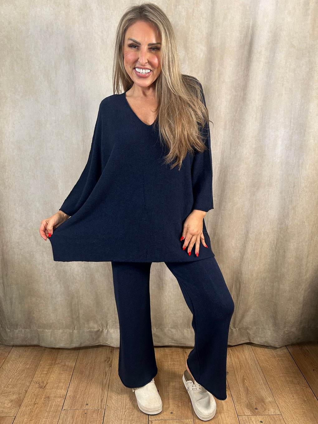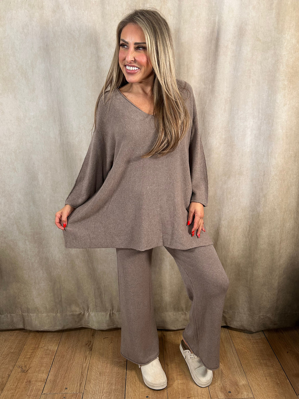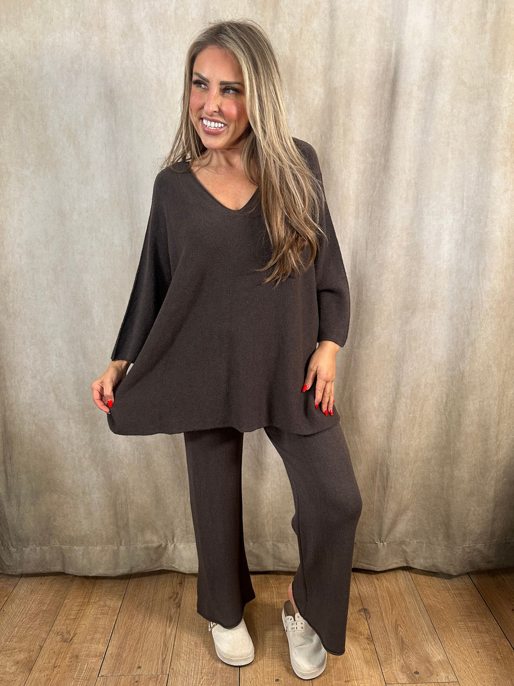 Relax in comfort and style with the Heather Loungewear set. Made in Italy from a soft blend of viscose, polyester, and polyamide, this cosy coord features a long-sleeved V-neck jumper and matching trousers for an effortlessly chic look. Designed to fit sizes 8–20, it’s perfect for laid-back days or casual outings. Available in a range of versatile shades – denim blue, black, navy, khaki, burgundy, brown, light grey, and mocha.