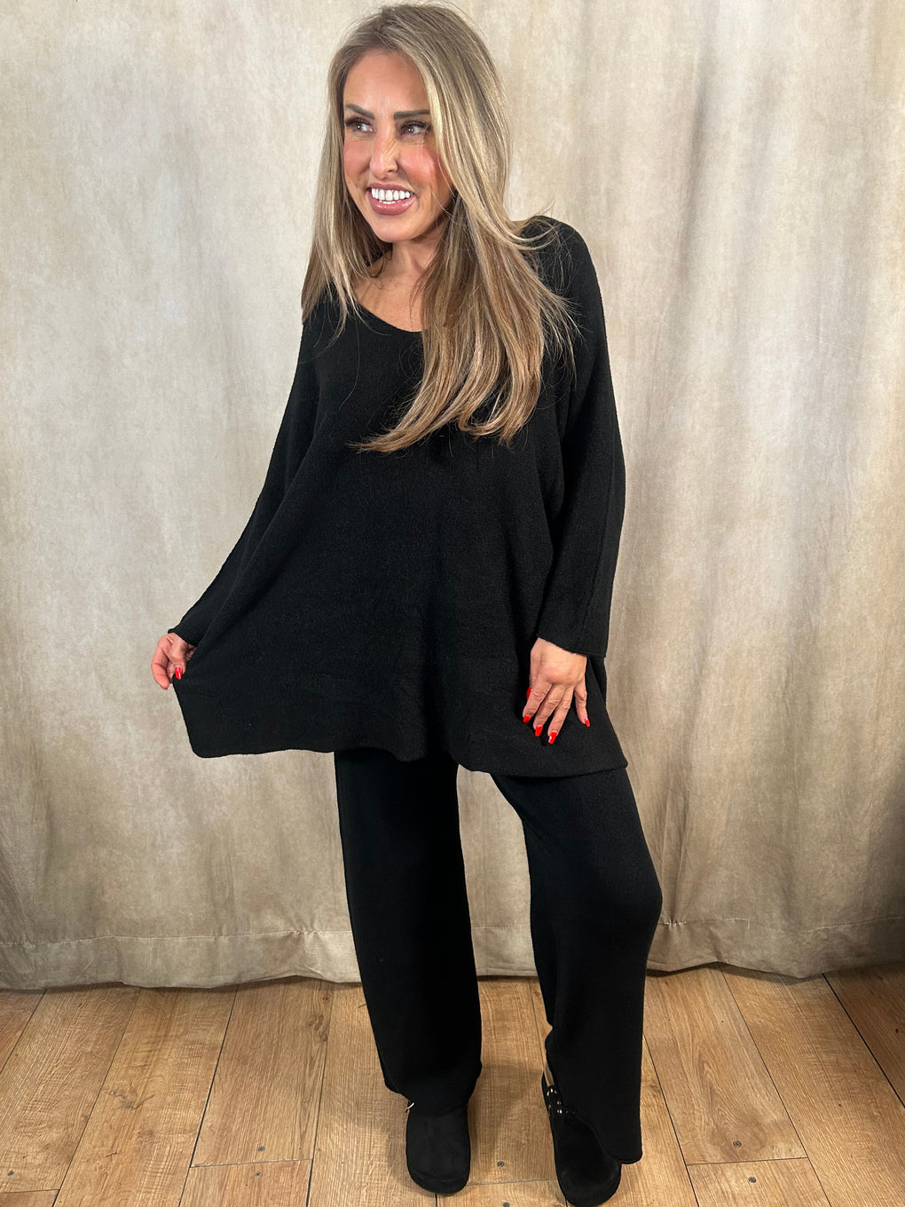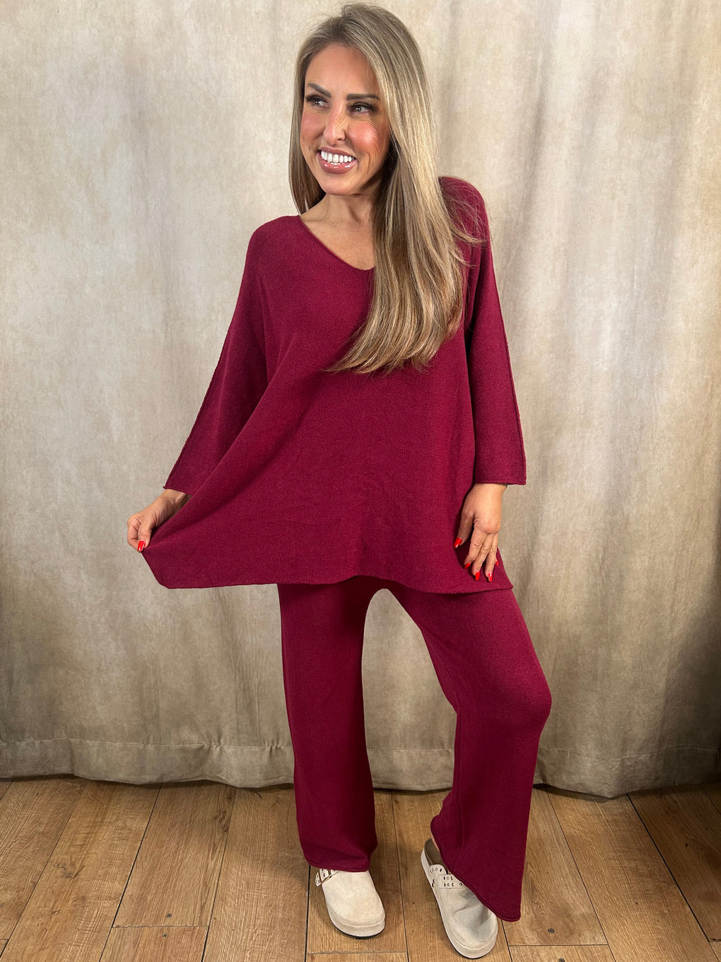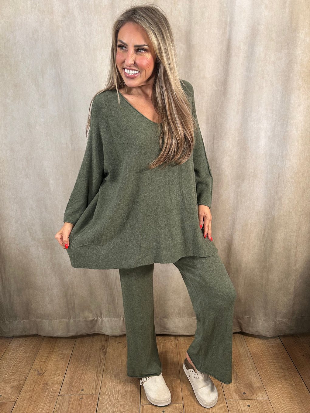 Relax in comfort and style with the Heather Loungewear set. Made in Italy from a soft blend of viscose, polyester, and polyamide, this cosy coord features a long-sleeved V-neck jumper and matching trousers for an effortlessly chic look. Designed to fit sizes 8–20, it’s perfect for laid-back days or casual outings. Available in a range of versatile shades – denim blue, black, navy, khaki, burgundy, brown, light grey, and mocha.
