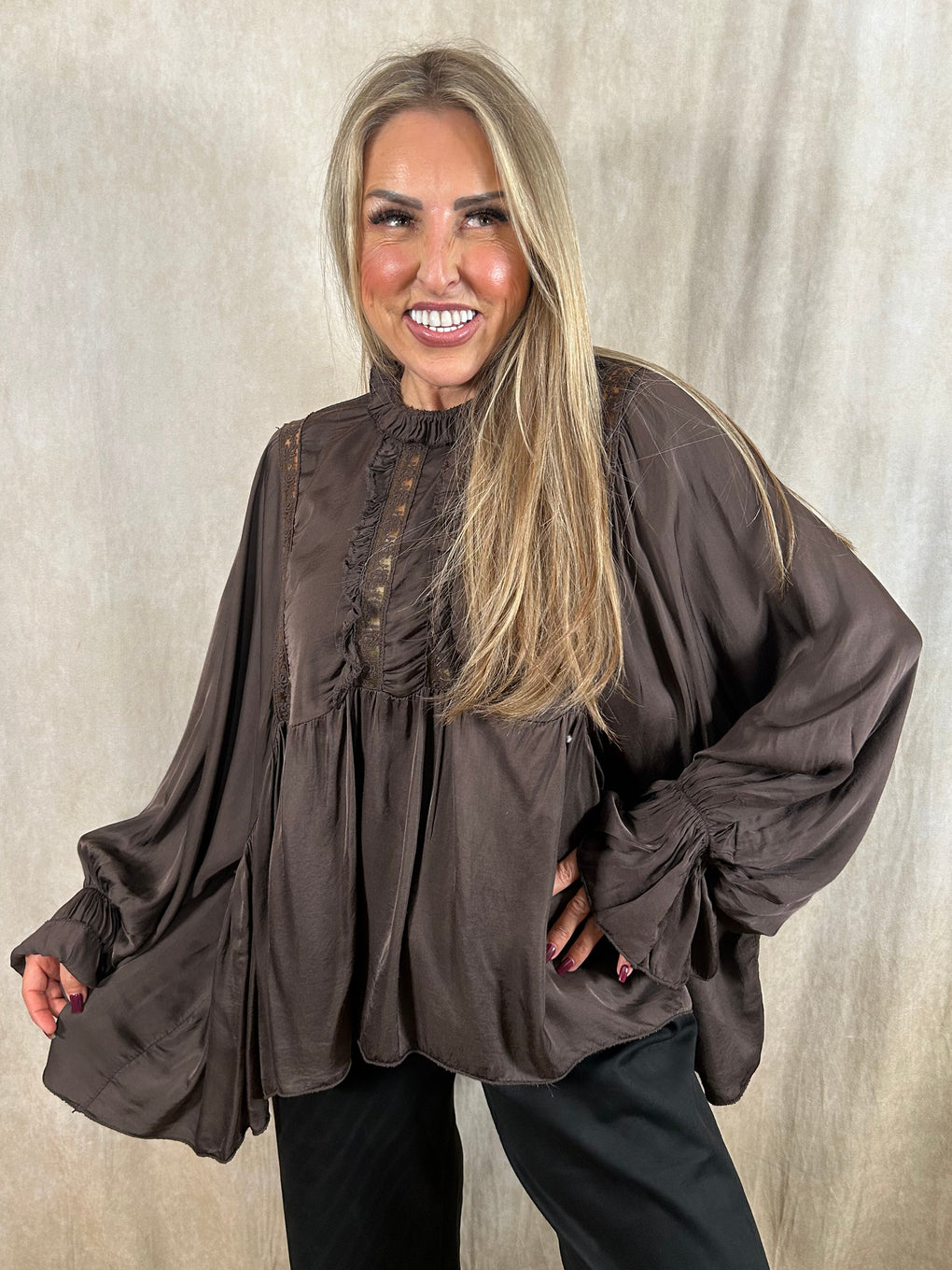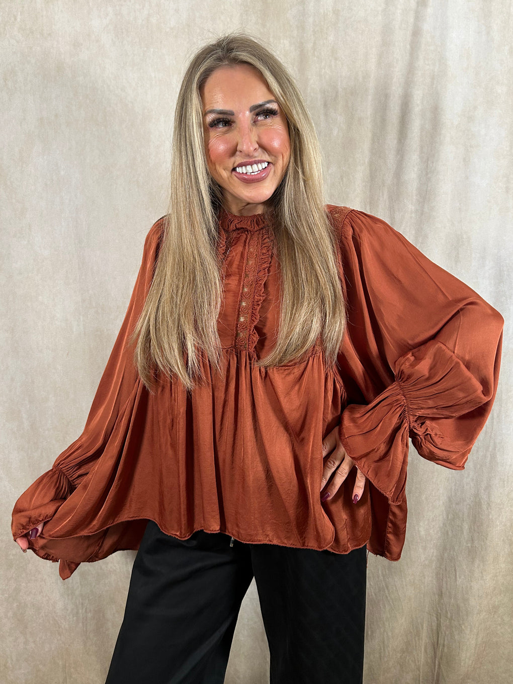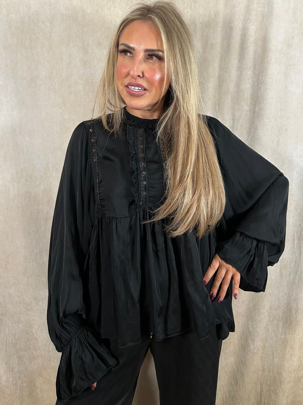 Effortlessly elegant, the Beattie Satin Blouse brings a touch of luxury to your everyday style. Crafted in Italy from beautifully soft viscose, this blouse drapes gracefully with a flattering relaxed fit. Designed as one size (8–18), it features romantic ruffle detailing, voluminous sleeves, and a gently gathered hem for a feminine silhouette.