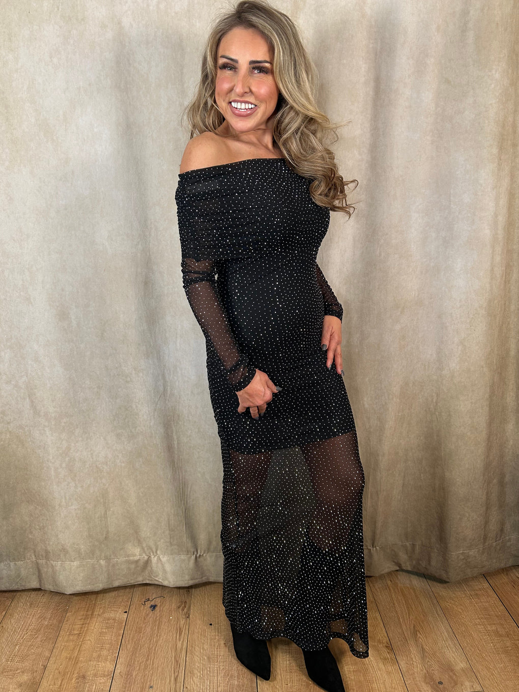 Turn heads in the stunning Evelyn Rhinestone Dress, crafted from a comfortable blend of polyamide and elastane for a flattering stretch fit. This off-the-shoulder design features elegant mesh/organza sleeves and a shimmering rhinestone finish that catches every light. A dramatic floor-length mesh overlay flows effortlessly over a knee-length base dress, creating a statement silhouette perfect for evenings out, special occasions, or any moment you want to shine.