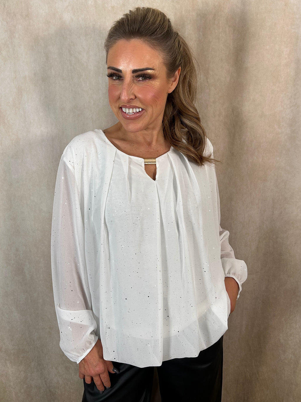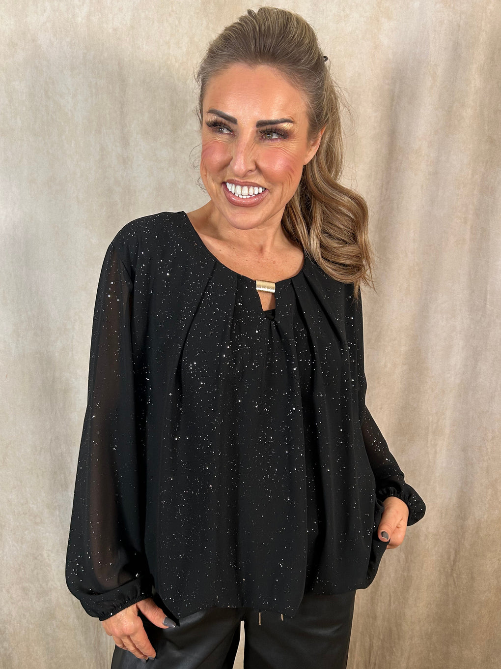 Add a touch of shimmer to your wardrobe with the Natalie Sparkle Blouse. Made in Italy from a soft blend of polyester, viscose and elastane, this long-sleeved design fits sizes 8–18 comfortably. It features an elegant sheer overlay, all-over sparkle, and a delicate metal bar that creates a subtle V cut-out at the neckline. Available in White, Chocolate and Black, it’s the perfect piece for effortless day-to-evening style.