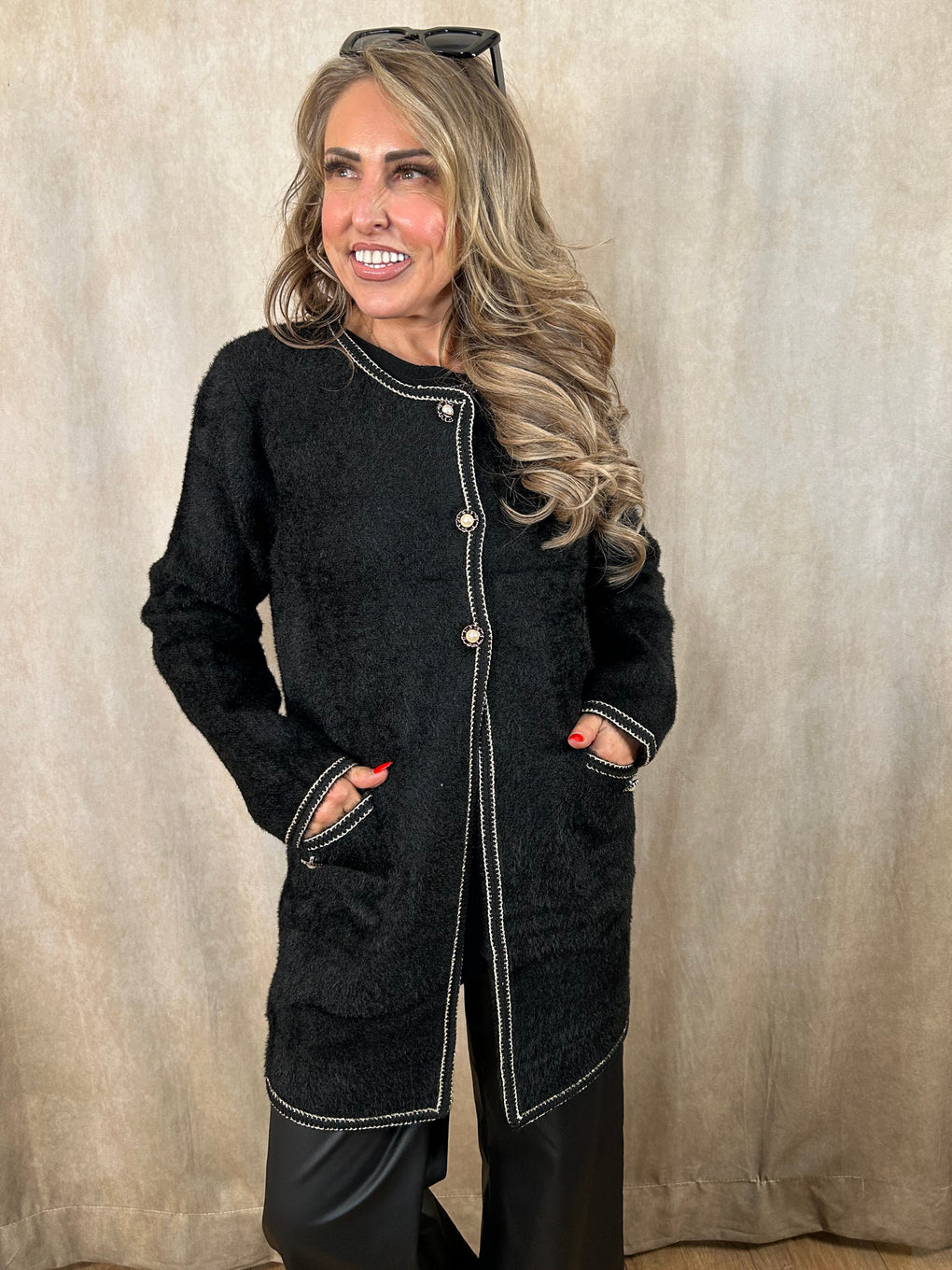 Elevate your layering game with the Rochelle Long Cardigan. Crafted from 100% polyamide, this longline cardigan features a unique half-button front, practical pockets, and a flattering relaxed fit. Available in classic black or soft cream, it comes in S/M (10–12) and M/L (14–16), making it a versatile style piece perfect for any wardrobe.