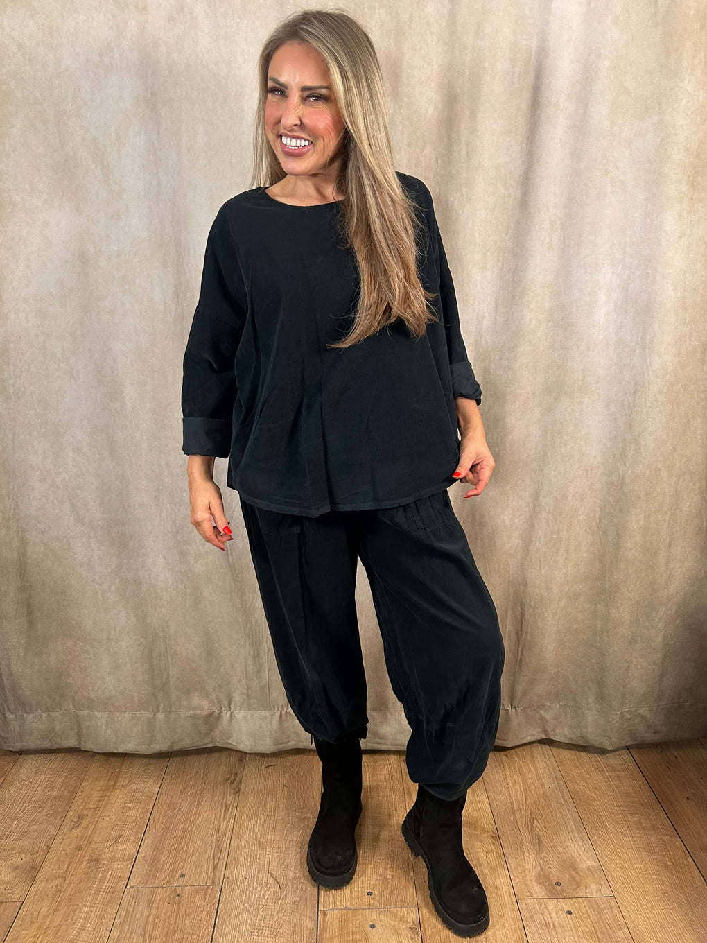 Effortless style meets everyday comfort with the Kathleen Corduroy Set. Made in Italy from 100% cotton, this soft two-piece features a relaxed long-sleeved top and matching tapered trousers for a laid-back yet polished look. Designed to fit sizes 8–16, it’s perfect for chic casual dressing. Available in five versatile shades – brown, navy, black, khaki, and mocha.