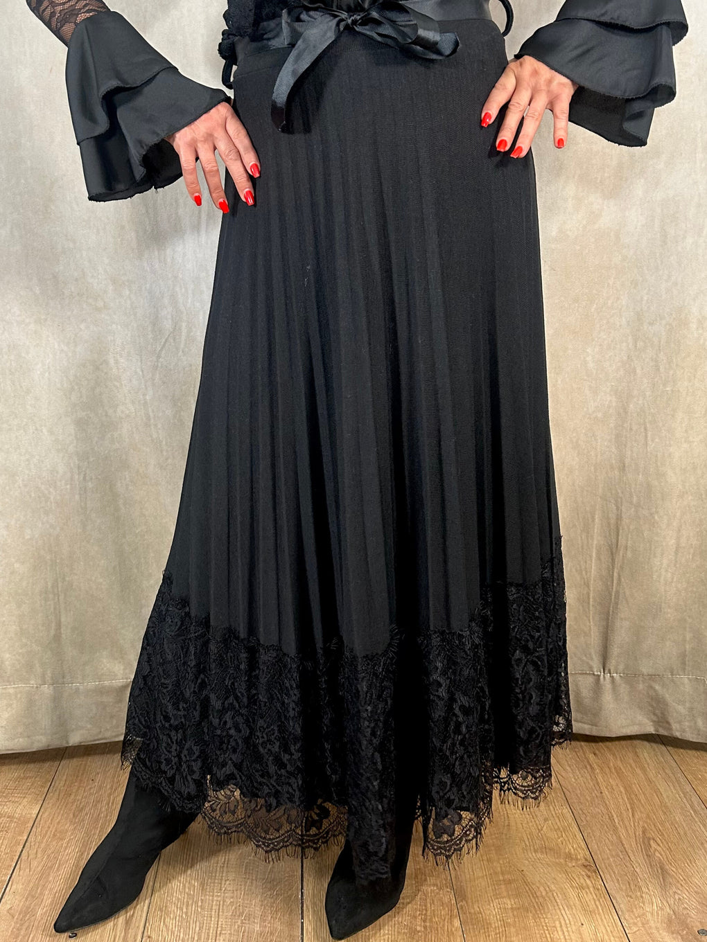 The Stefani Skirt exudes timeless elegance with a modern twist. Made in Italy from a soft blend of viscose, wool, and elastane, this pleated black maxi skirt flows beautifully for a flattering silhouette. Finished with delicate lace detailing along the hemline and a chic black ribbon belt tie for added femininity. Designed in one size (8–16).