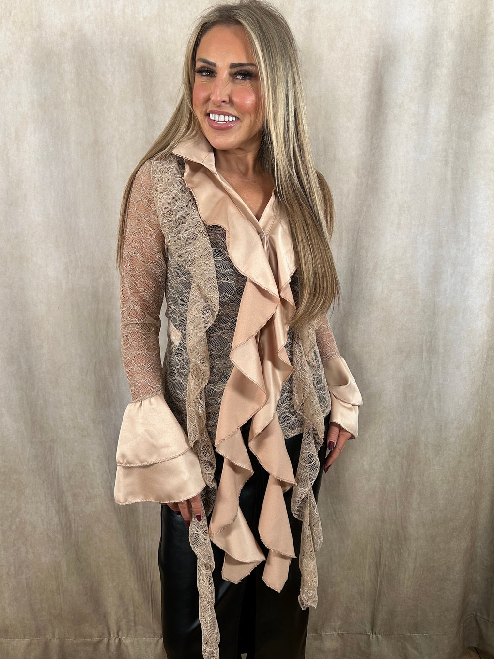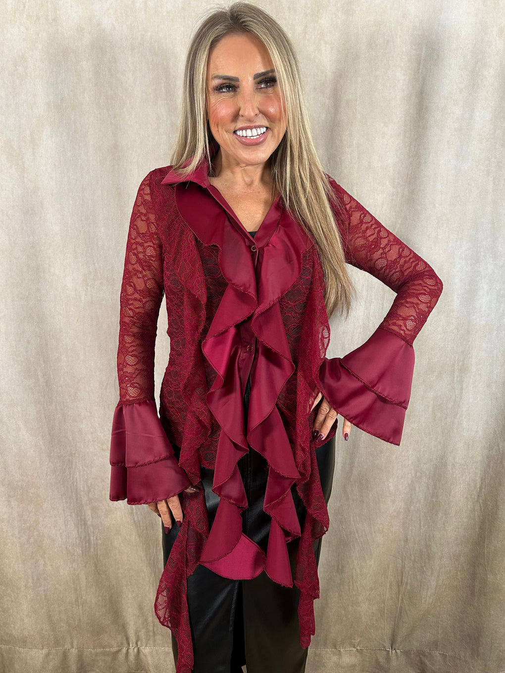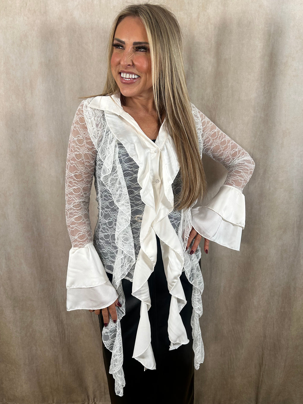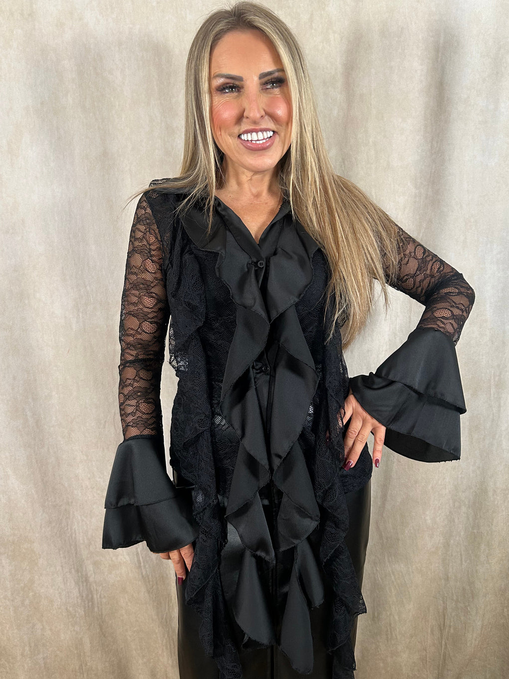 Made in Italy from a soft blend of polyester, viscose and elastane, the Lucille Top delivers romantic detailing with effortless wear. Featuring sheer lace sleeves and body, dramatic layered ruffle front and fluted satin-look cuffs for an elegant, statement finish.