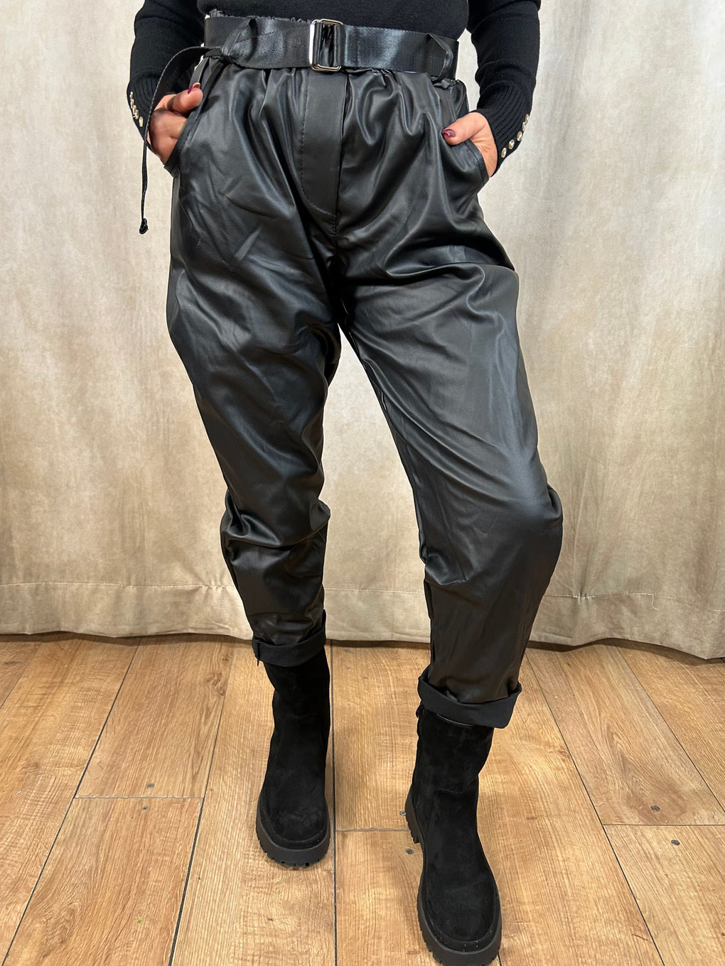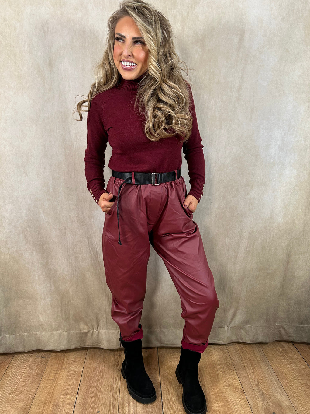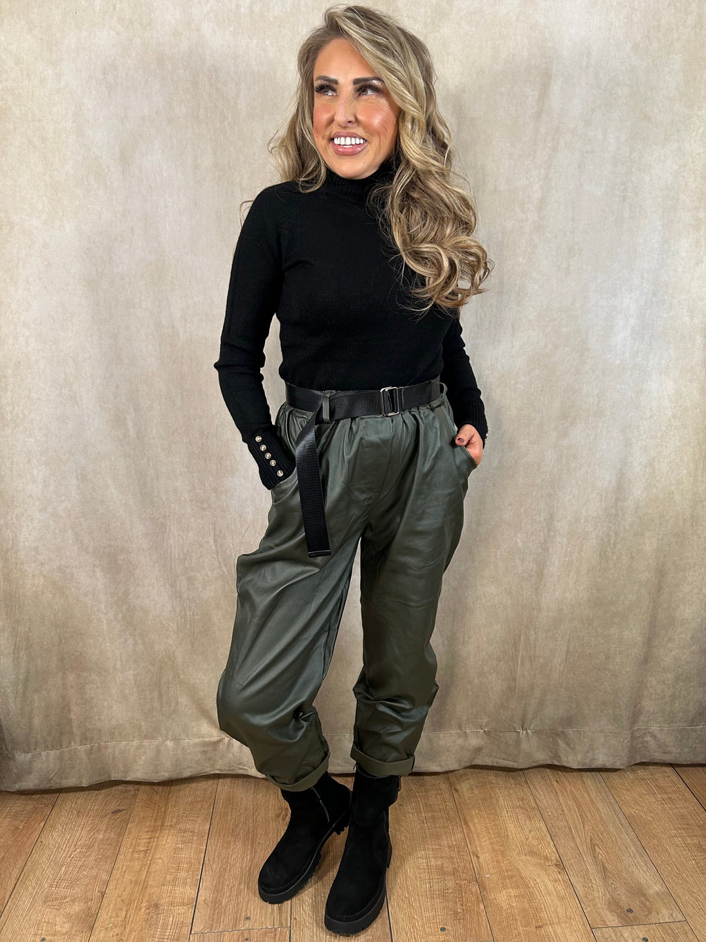 Elevate your wardrobe with these chic Belted PU Leather Magic Trousers. Crafted in Italy from a comfortable blend of viscose, polyester, and elastane, they offer a flattering fit for sizes 8–16. Featuring a stylish belt, practical pockets, and trendy turn-up legs, these versatile trousers are perfect for day-to-night wear. Available in burgundy, khaki, black, brown, navy, and charcoal grey.