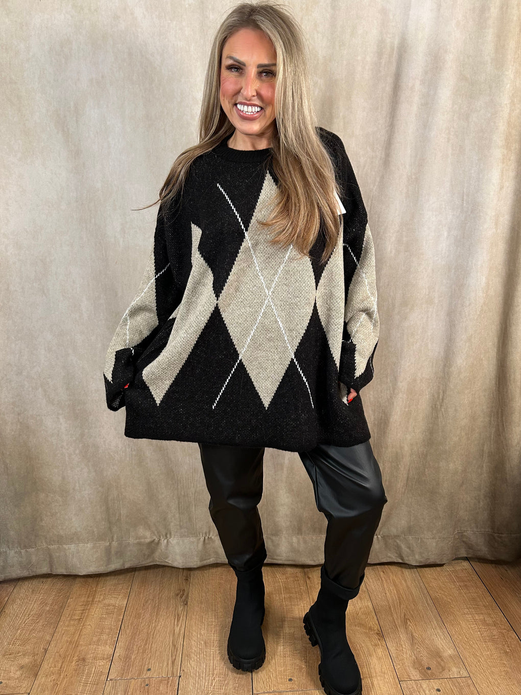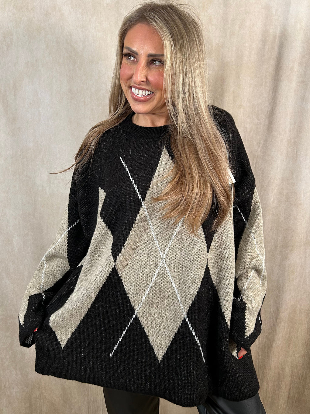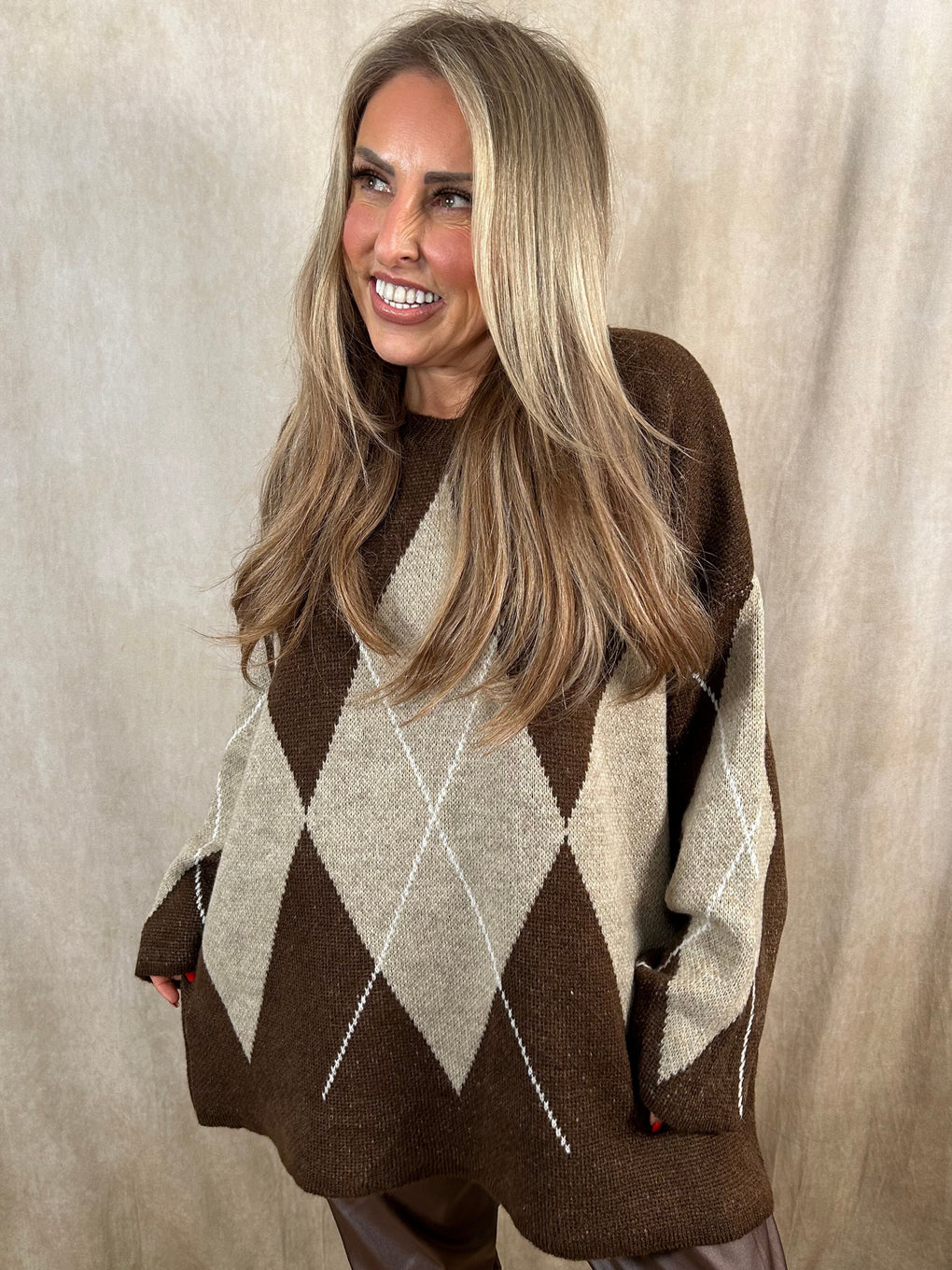 Add a touch of statement style to your winter wardrobe with the Dawn Diamond Jumper. This cosy long-sleeved knit features a bold large diamond embroidery detail for a chic, modern look. Designed to fit sizes 8–18, it’s made from a soft blend of acrylic and polyamide for ultimate comfort. Available in two classic colourways – black and beige or brown and beige – perfect for effortless everyday styling.