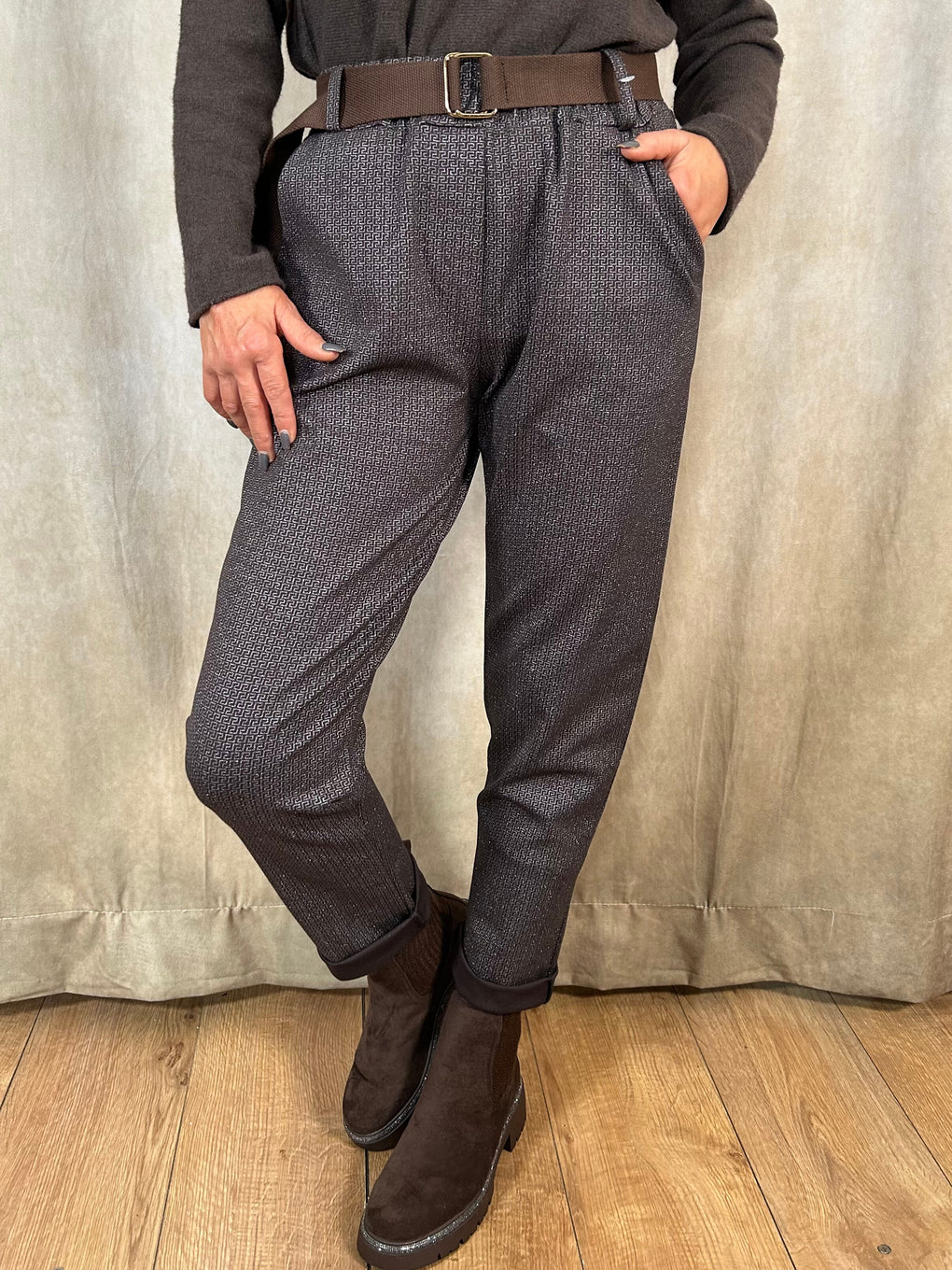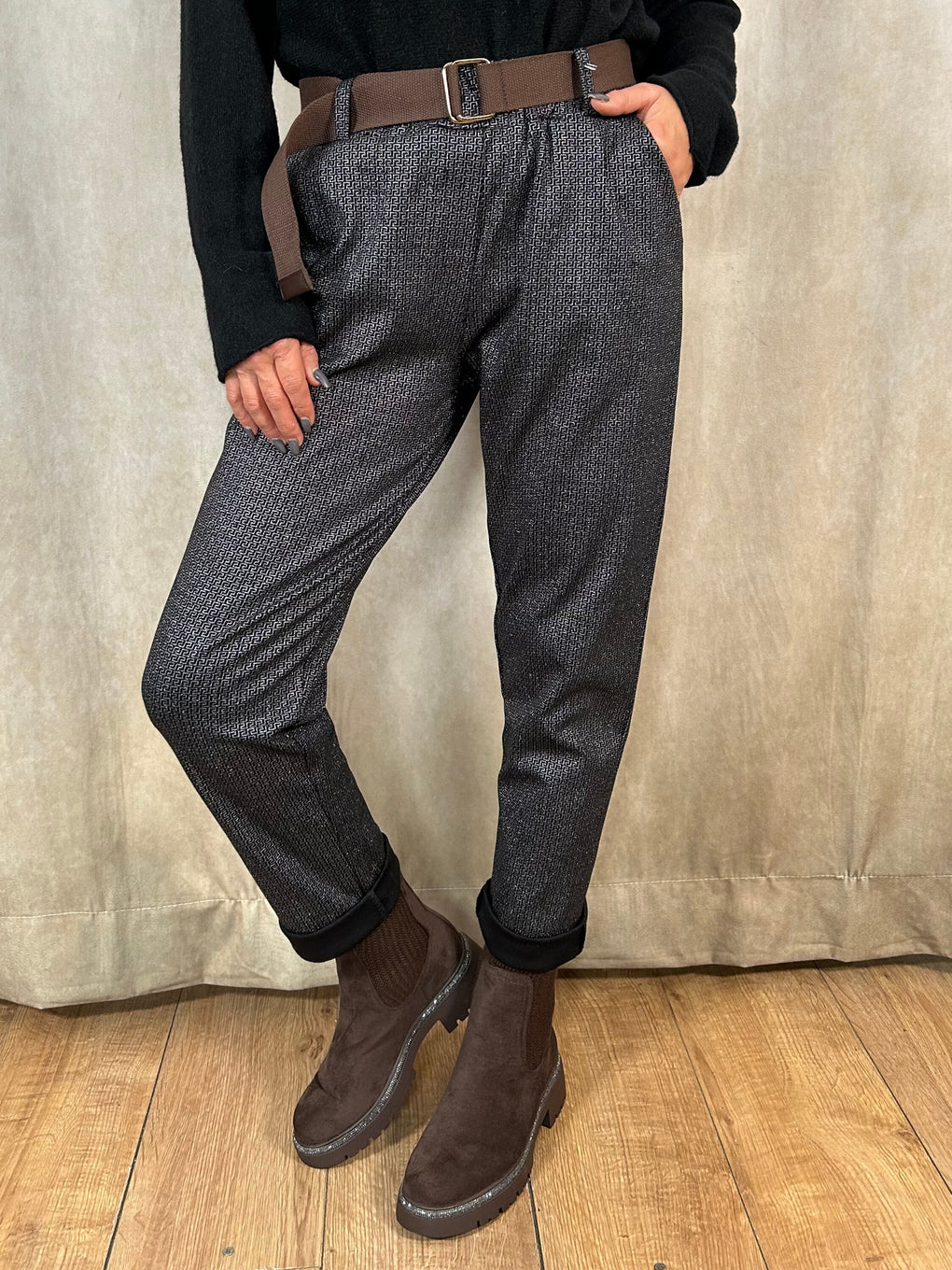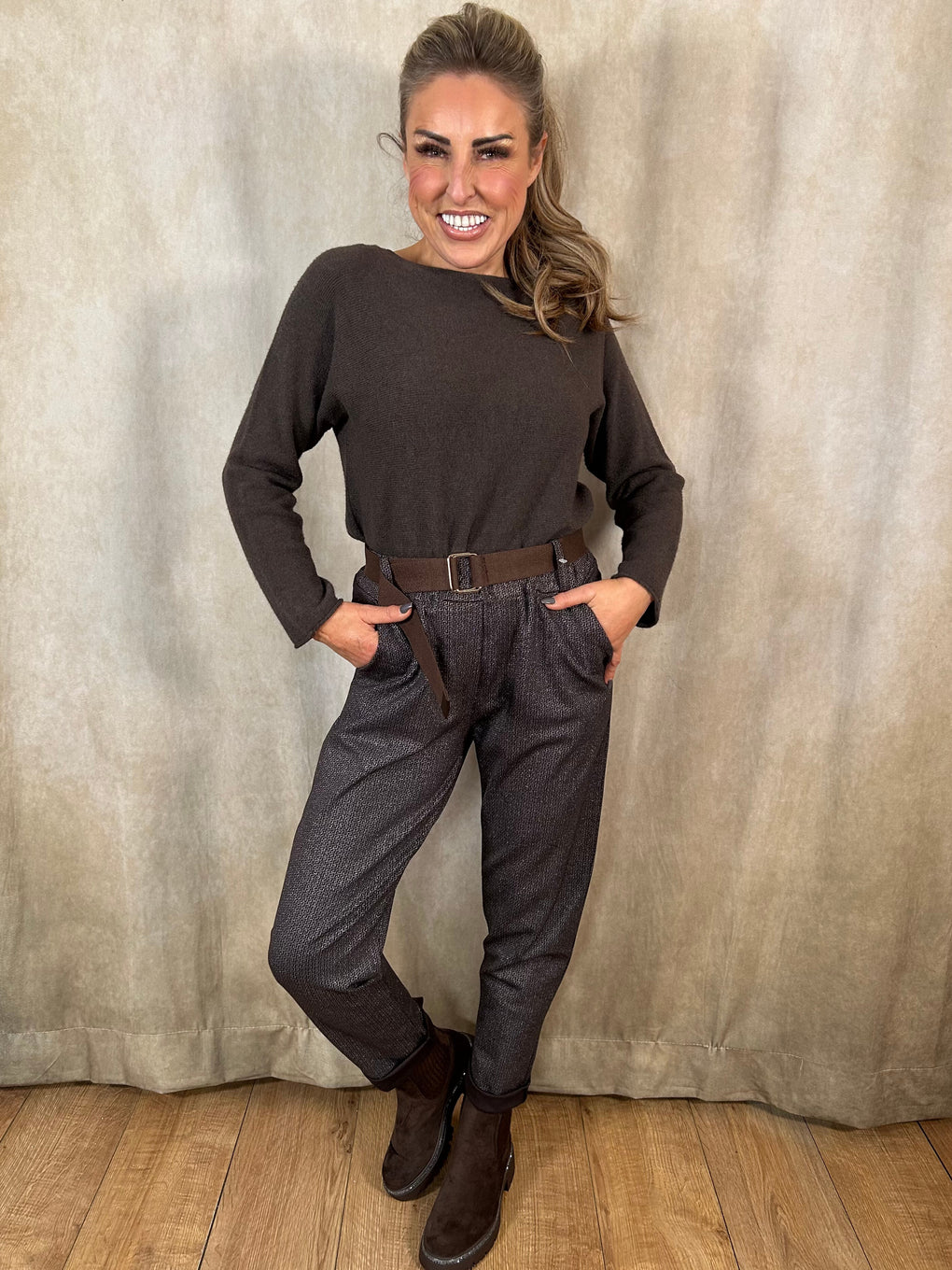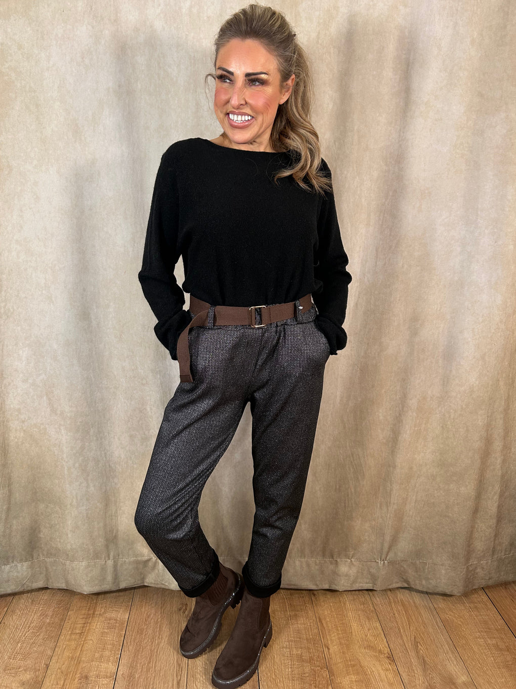 Step into effortless style with the Edwina Belted Trousers, crafted in Italy from a comfortable blend of viscose, nylon and elastane. Designed to fit sizes 8–16, these tapered trousers feature a flattering high-rise waist, adjustable belt and practical pockets. Available in Black or Brown, they’re the perfect smart-casual staple for everyday wear.