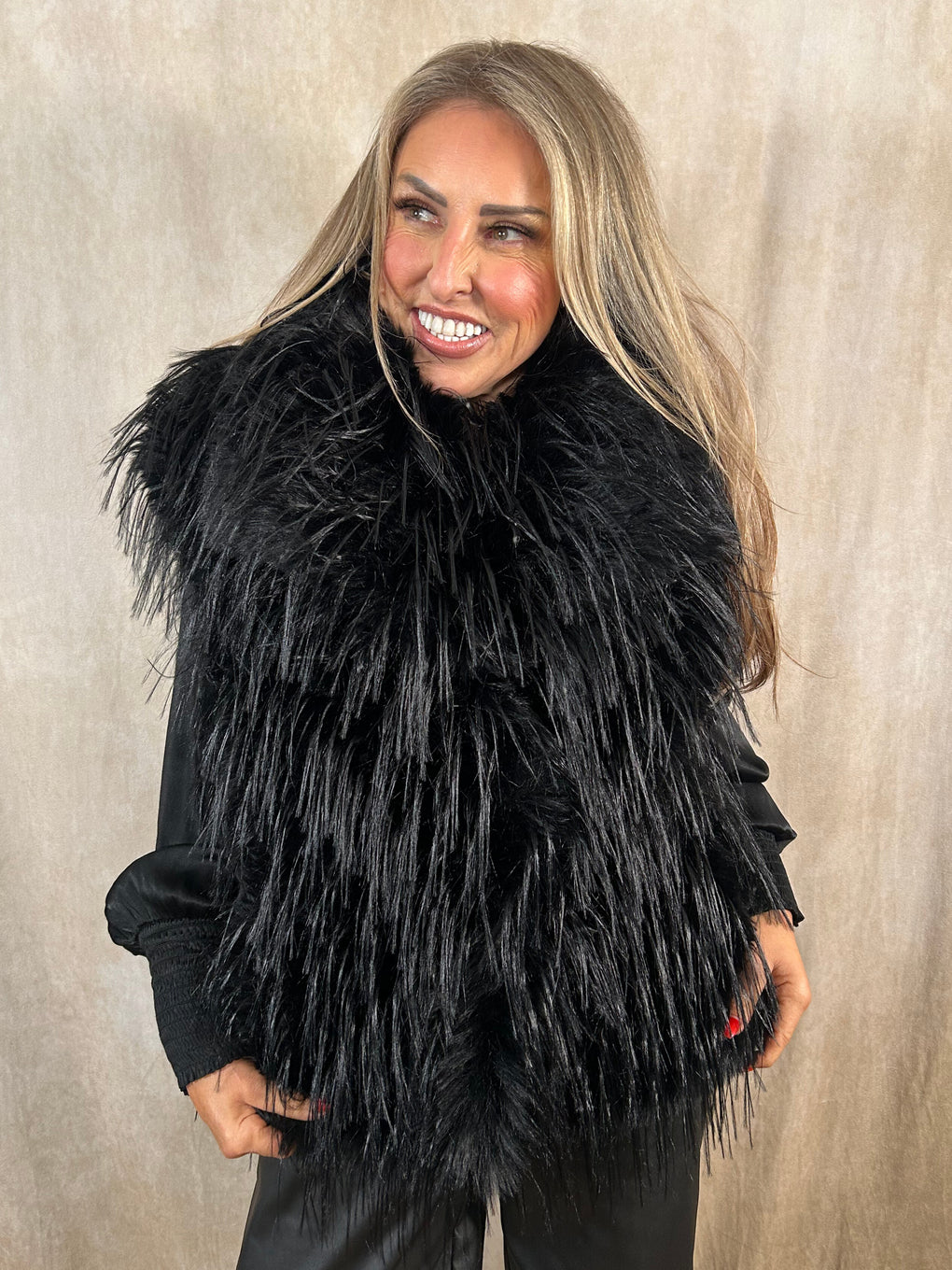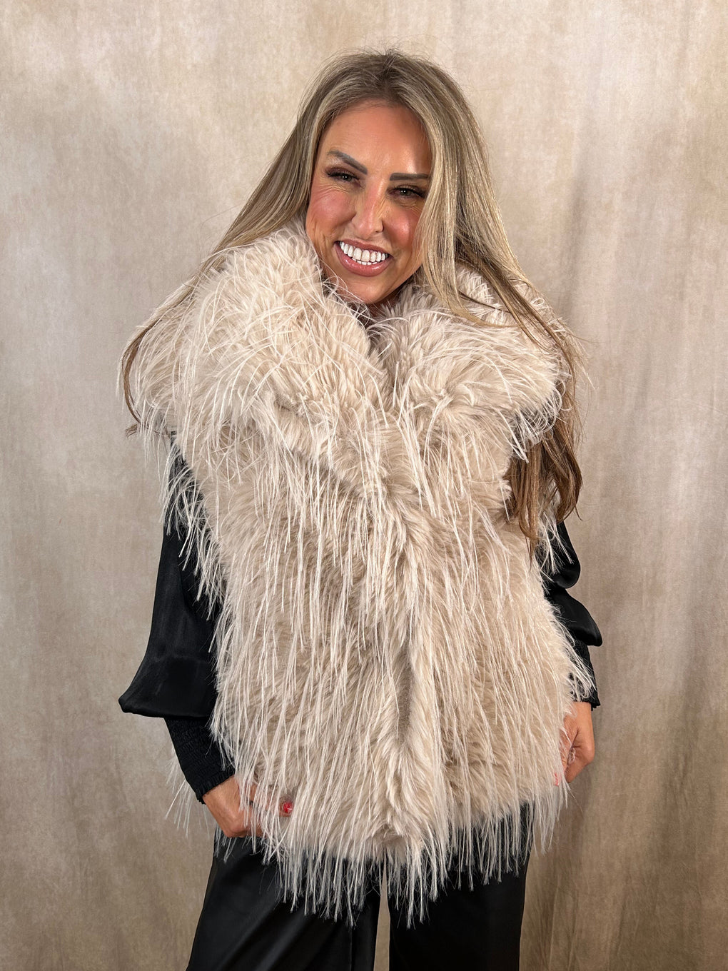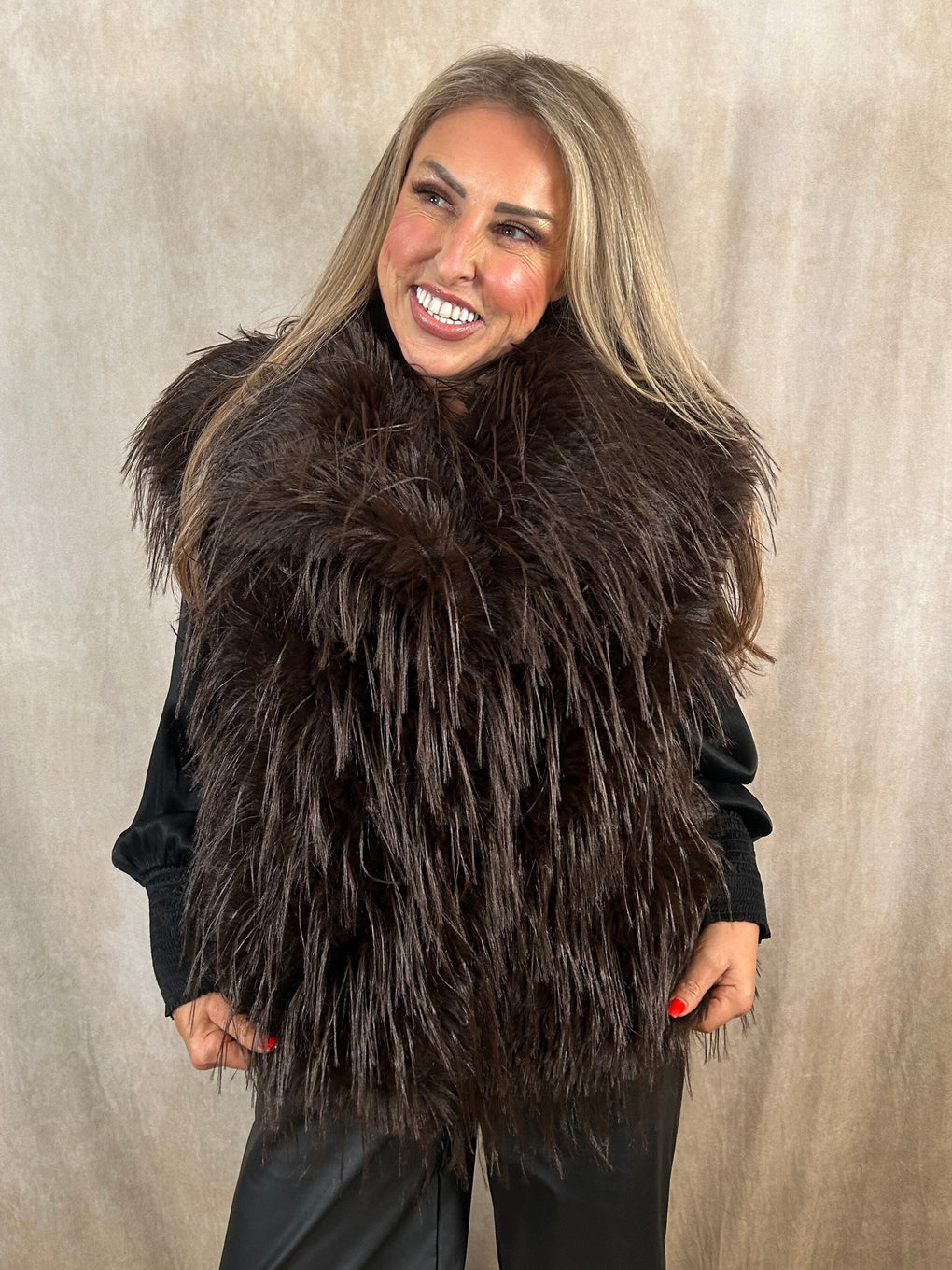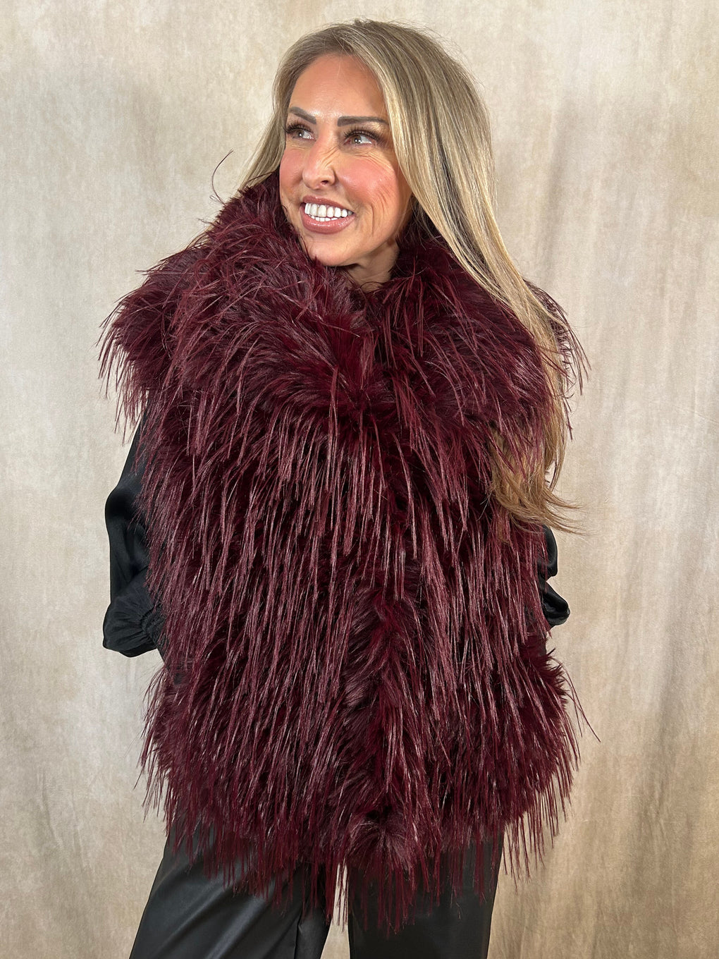 Elevate your look with the chic Gillian Gilet, a trendy shaggy fur sleeveless layer featuring an oversized collar for added style and warmth. Crafted from soft polyester, this statement piece is perfect for adding texture to any outfit. Available in sizes S/M (10–12) and M/L (14–16), and in four stunning shades – burgundy, black, brown, and beige – it’s the ultimate finishing touch for effortless, on-trend layering.