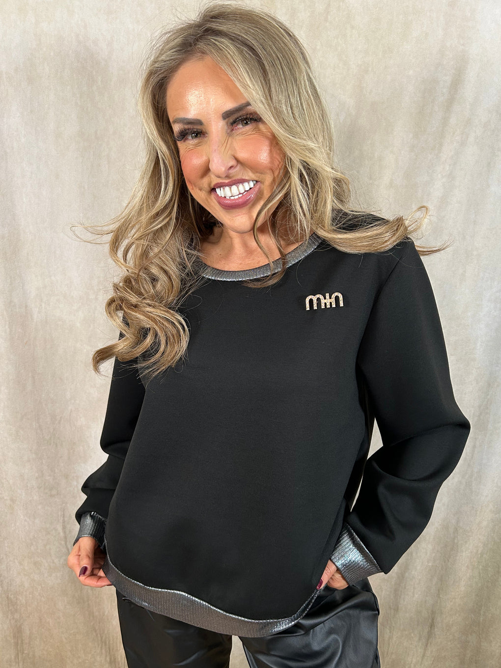 Elevate your casual wardrobe with the Sandra Sweatshirt – where comfort meets understated glam. This soft-touch black sweatshirt features subtle shimmer trim detailing on the neckline, cuffs, and hem, giving it a chic, elevated edge. Finished with a gold logo embellishment on the chest for a touch of signature style.