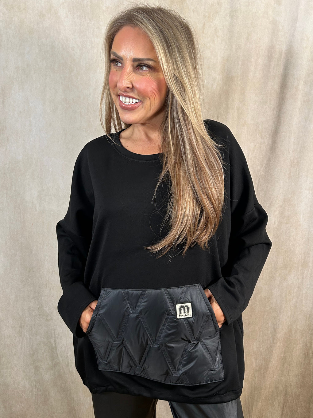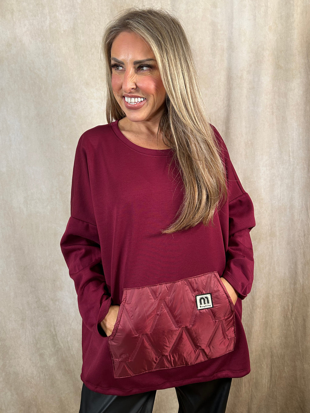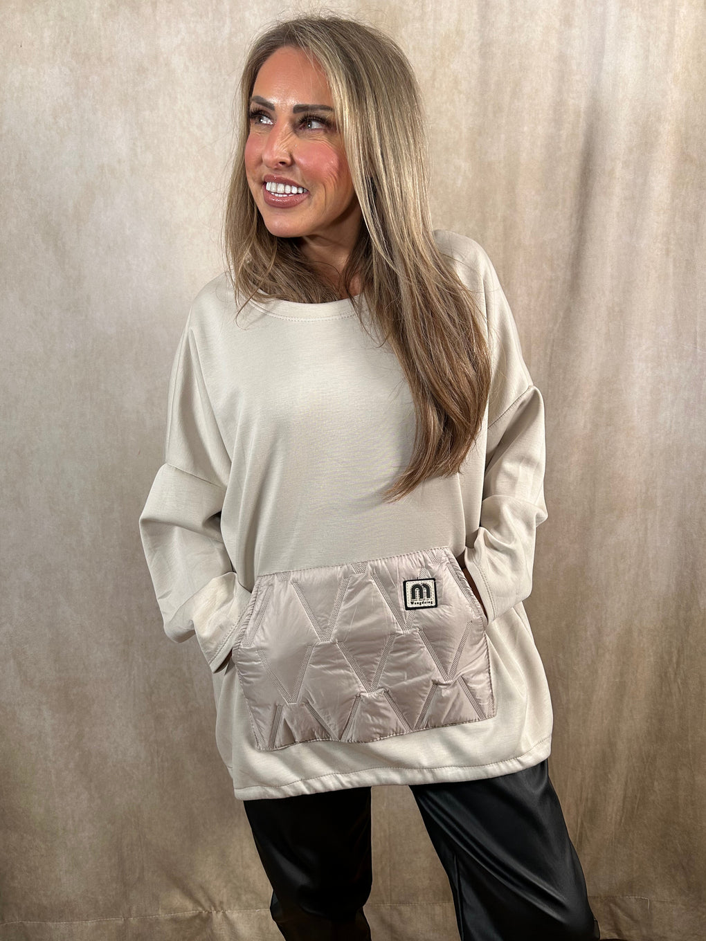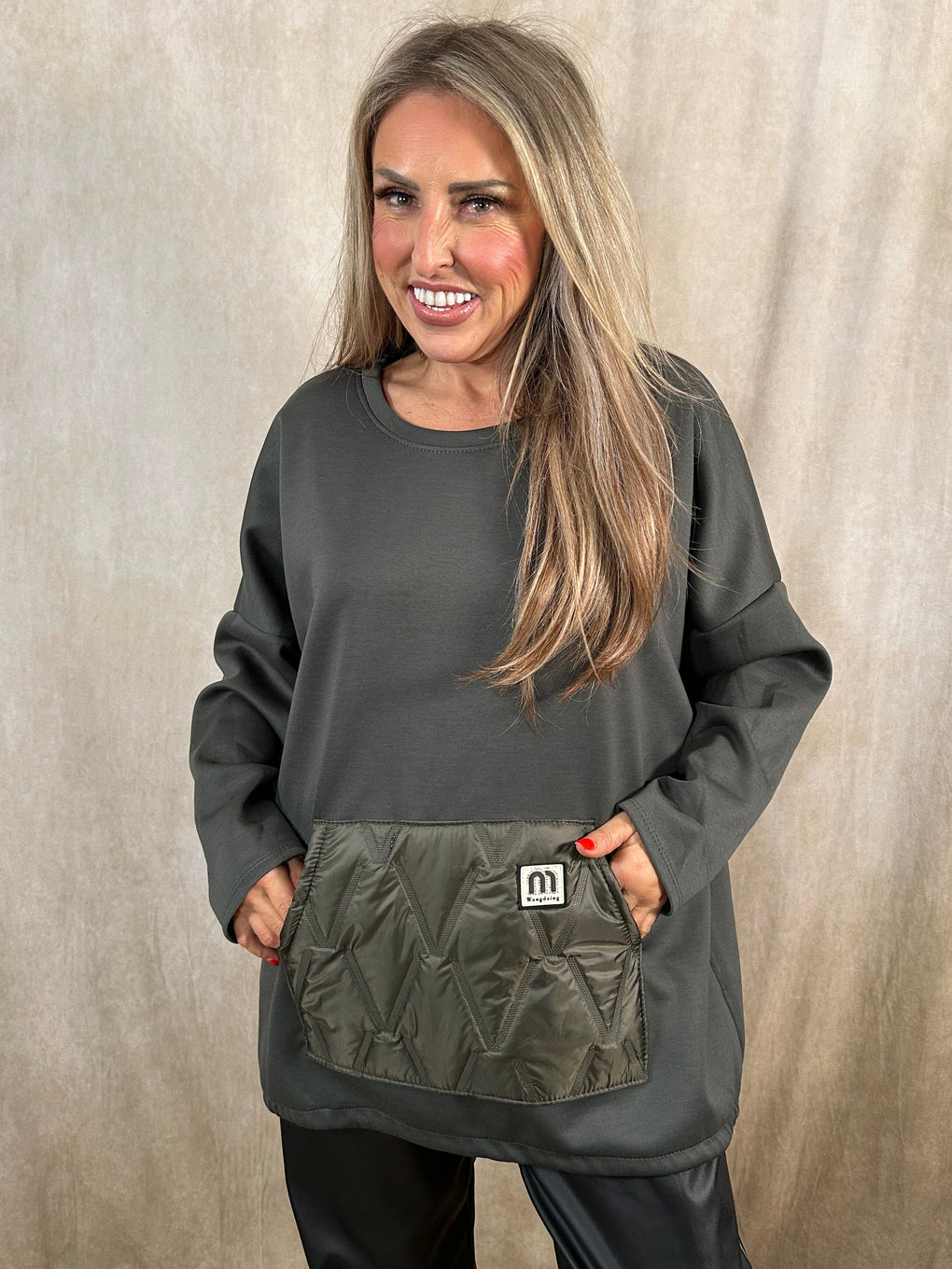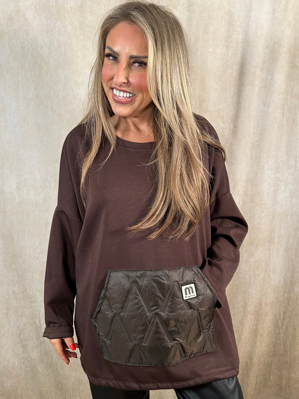 Keep it casual yet stylish with the Saskie Sweatshirt. Made in Italy from a soft blend of viscose and elastane, this long-sleeved sweatshirt offers comfort with a touch of detail. It features a quilted front patch pocket for a modern twist on a classic design. Designed to fit sizes 8–16 and available in khaki, chocolate, beige, black, and burgundy – the perfect everyday essential.