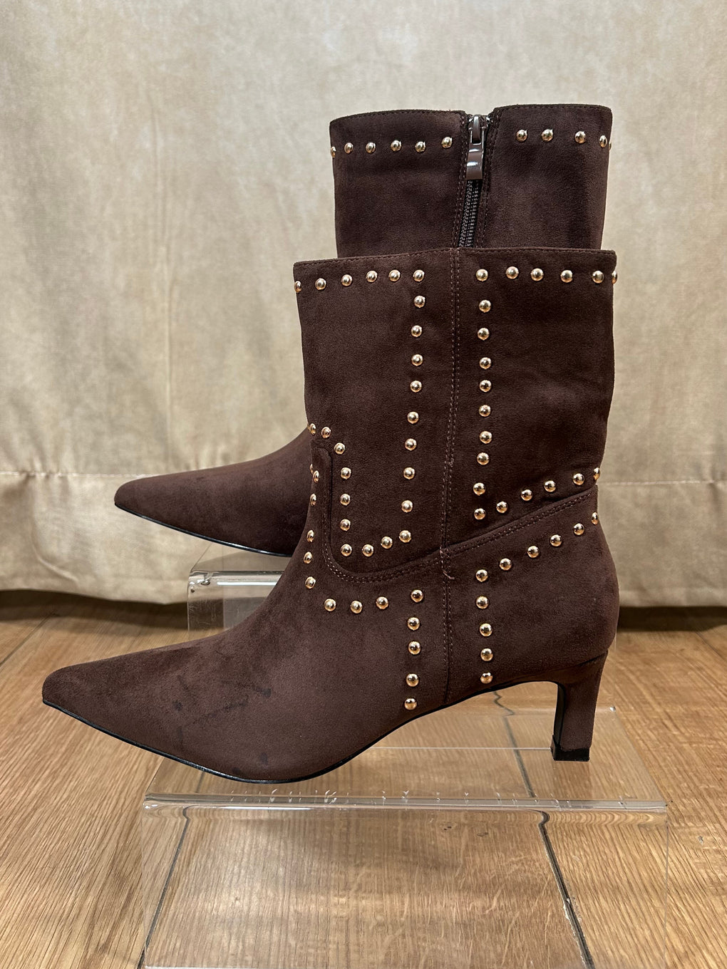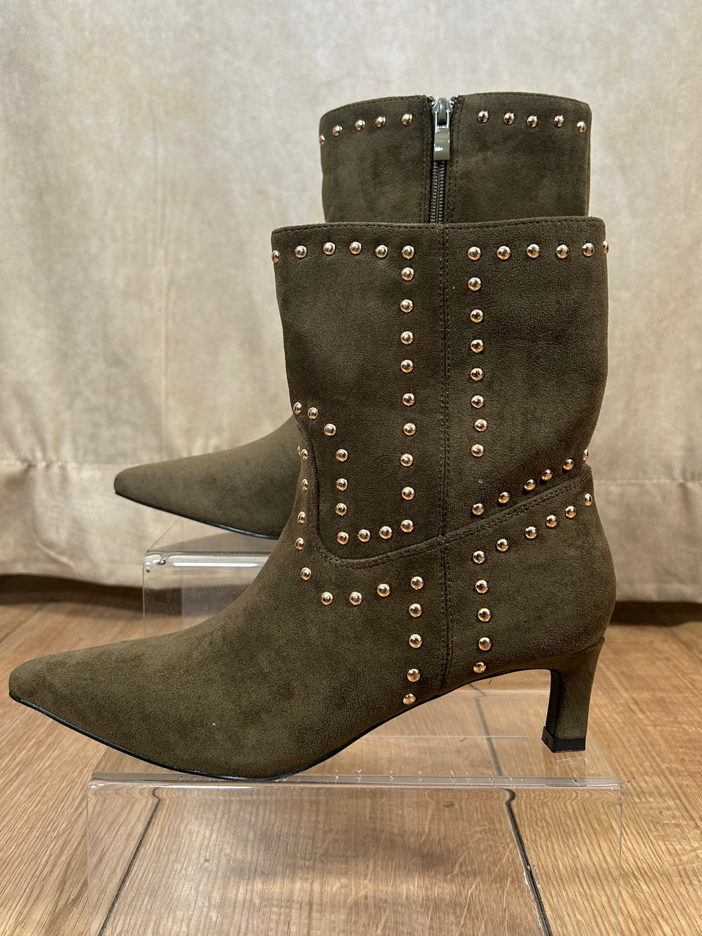 Step out in style with the Shannon Studded Boots. Available in khaki or brown and sizes 3–8, these short ankle boots feature a sleek pointed toe, mid heel, and an easy inside zip fastening. Finished with eye-catching all-over stud detailing, they add the perfect edgy touch to any outfit.