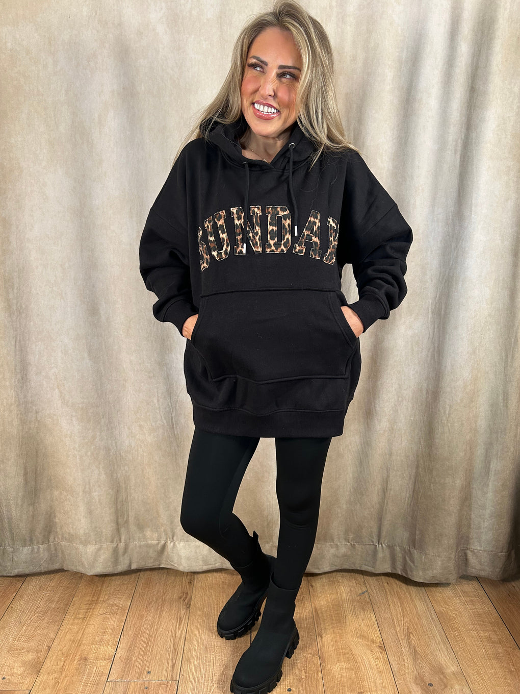 Stay stylish and comfortable all weekend long with our Sunday Loungewear Set. Featuring a soft hoody with front pockets and bold ‘Sunday’ lettering in leopard print, paired with matching leggings, this set is perfect for relaxing in style. Made from a cosy cotton and polyester blend, it’s available in Black and Leopard Print, and comes in sizes S (10–12), M (12–14), and L (14–16).