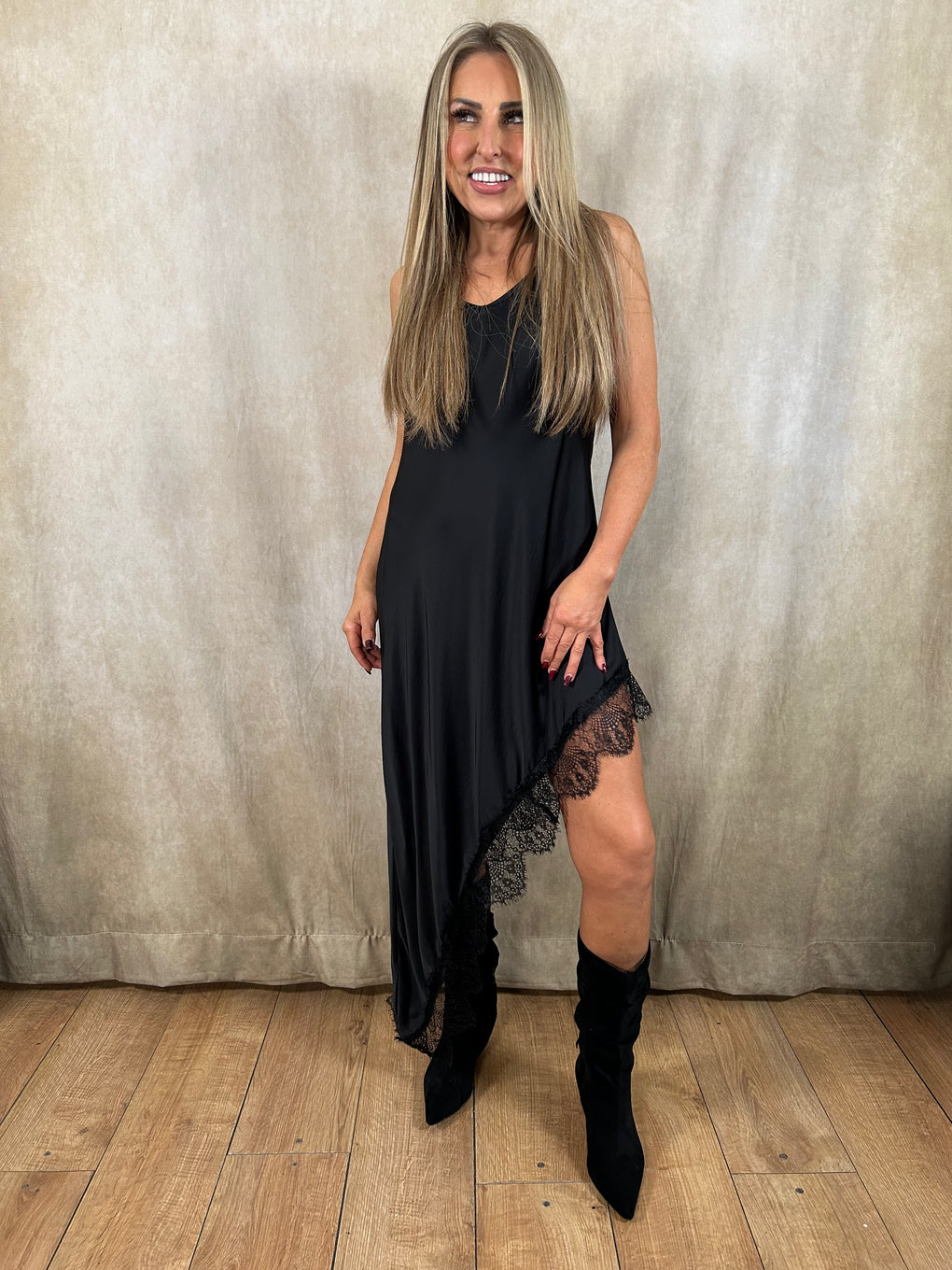 A romantic sleeveless V-neck maxi in fluid viscose with a soft satin sheen. Made in Italy, the Suzy features an elegant asymmetric hemline finished with delicate lace trim for a refined, dress-up finish with easy drape and movement.