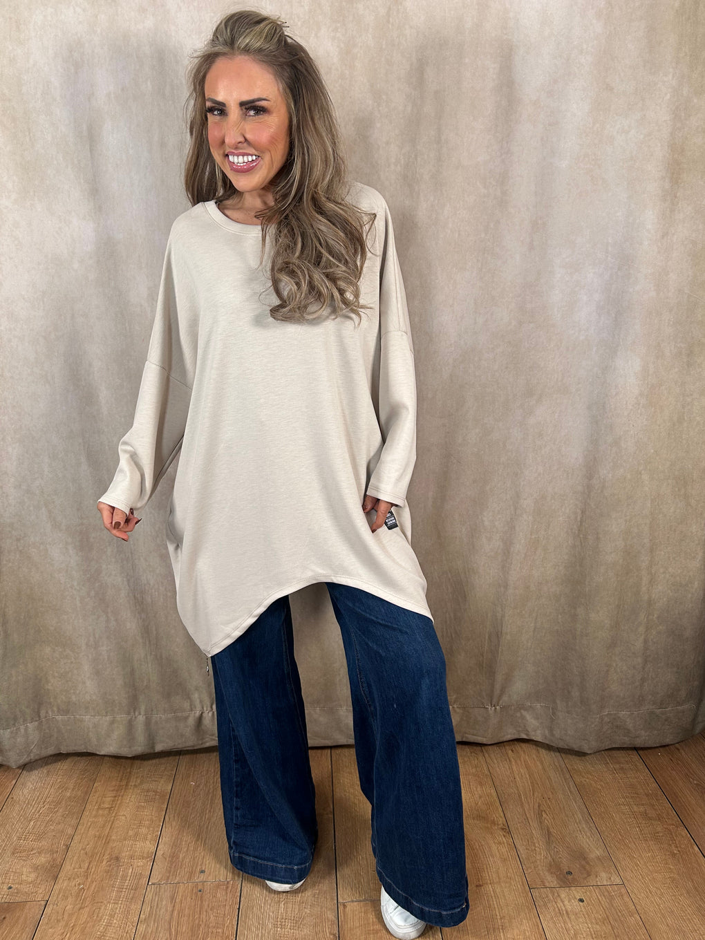 The Sybil Sweatshirt is a relaxed longline style with turn-back cuffs, perfect for effortless everyday wear. Crafted from a soft blend of viscose and elastane, it offers comfort with a flattering fit. Designed in one size (8–20) and available in Beige, Khaki, Chocolate, Mocha, Black, Navy and Burgundy.